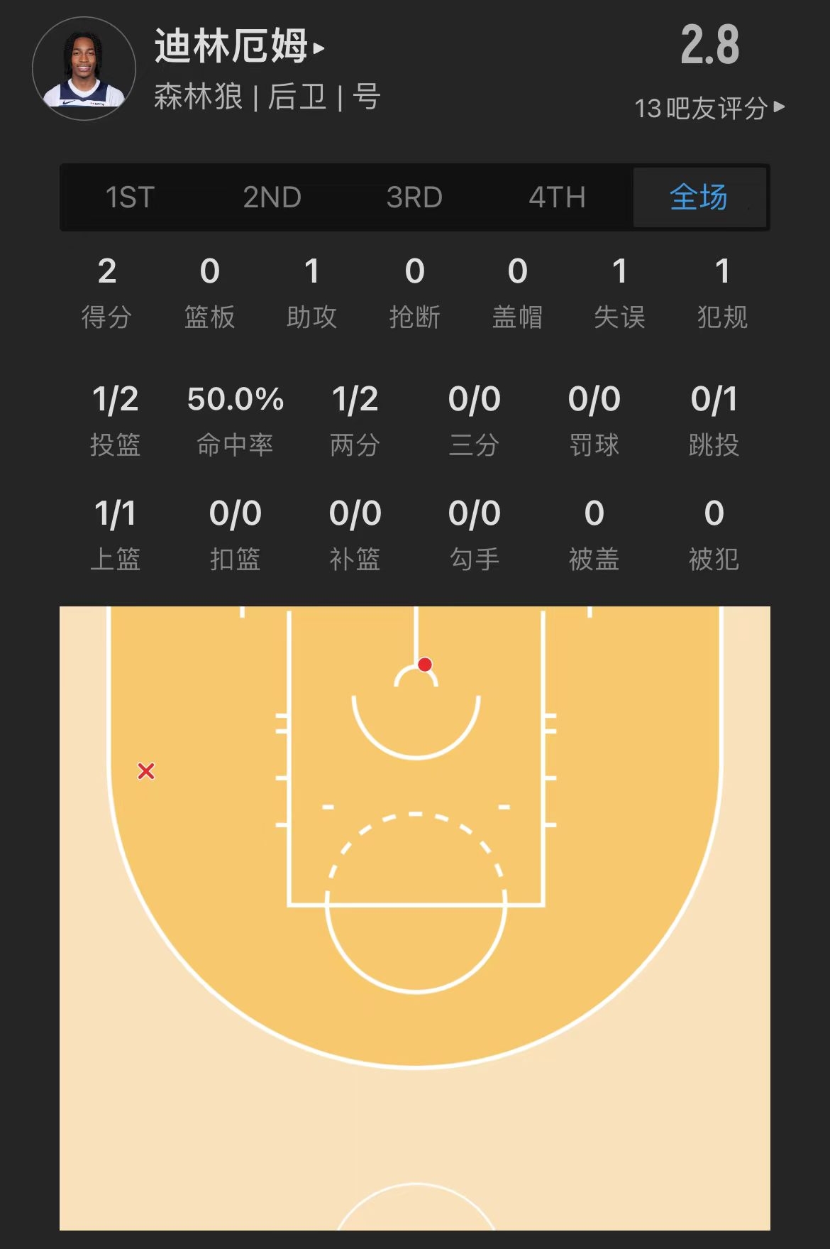森林狼8号秀 罗布-迪林厄姆 登场9.7分钟