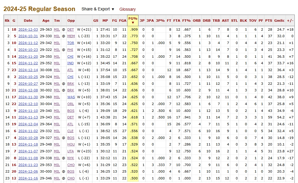 12月16日讯 美媒今天晒出一项数据:字母哥本赛季出战的23场比赛,命中率从未低于五成!