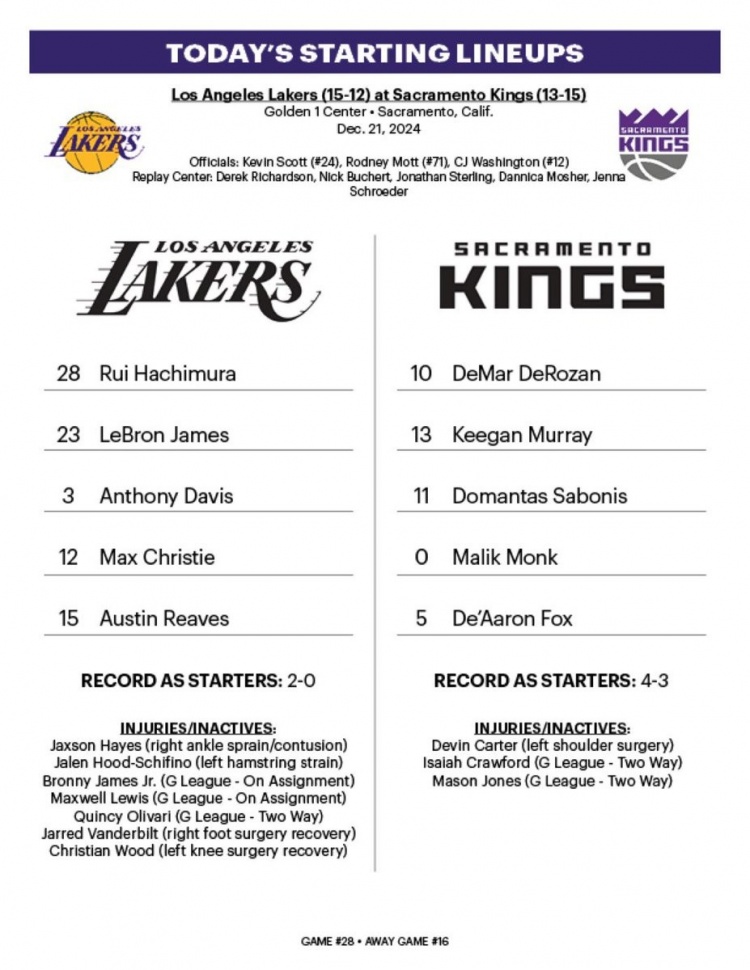 12月22日讯 今日湖人继续客场挑战国王,双方赛前公布了本场比赛的首发阵容。
