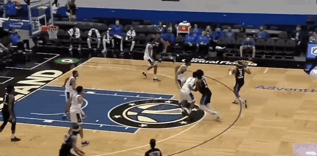 左手运球突到禁区内的跑勾,对手甚至都没反应过来,等球过头顶了才下意识地起跳