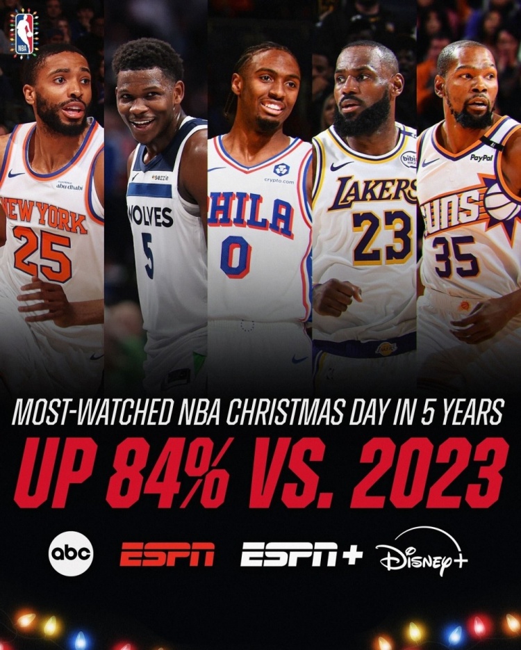 此外,本届圣诞大战成为5年来NBA收视率最高的圣诞大战,ABC、ESPN, ESPN+ & Disney+等平台的收视率相比去年增长84%,每场比赛的平均观看人数达到525万。