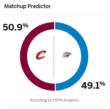 ESPN预测了本场比赛胜率,其中客场作战的骑士为50.9%,雷霆为49.1%。