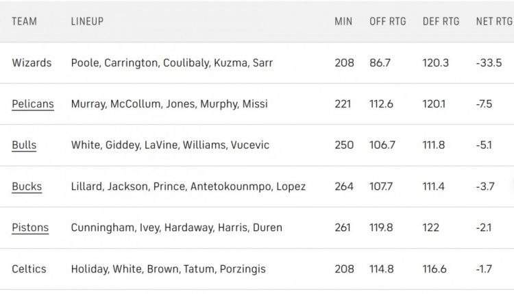 意外之处:一些联盟最差的球队出现在榜单前列(奇才、鹈鹕、公牛),但随后情况变得奇怪。雄鹿的这套阵容比其他任何阵容首发的次数都多,尽管有MVP候选人字母哥和状态复苏的利拉德,但他们的五人组却完全无效。同样令人惊讶的是,卫冕冠军凯尔特人(并且仍然是本赛季的夺冠热门)的首发阵容竟然是联盟中的第六差阵容(至少共同出场200分钟)。而如果把波尔津吉斯换成霍福德,你就得到了联盟最强的五人组,真是让人摸不着头脑。