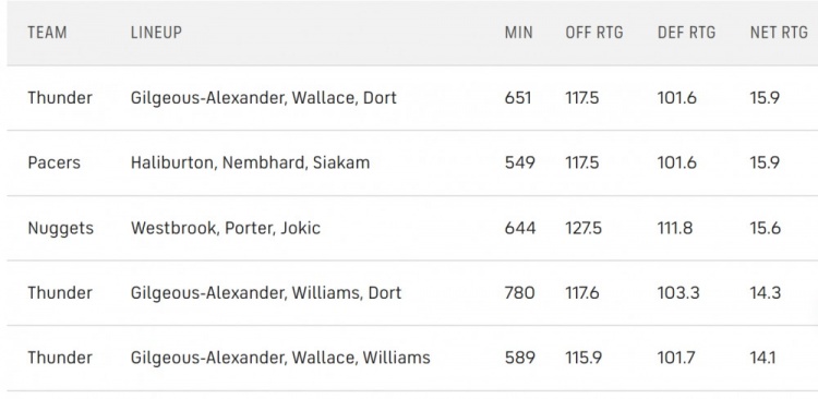 上图可见:第一名为雷霆的亚历山大、华莱士和多特;第二名为步行者的哈利伯顿、内姆哈德和西亚卡姆;第三名为掘金的威少、小波特和约基奇;第四名为雷霆的亚历山大、杰伦-威廉姆斯和多特;第五名为雷霆的亚历山大、华莱士和杰伦-威廉姆斯。