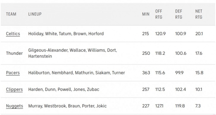 上图可见:第一名为凯尔特人的霍勒迪、怀特、塔图姆、杰伦-布朗和霍福德;第二名为雷霆的亚历山大、华莱士、杰伦-威廉姆斯、多特和哈尔滕施泰因;第三名为步行者的哈利伯顿、内姆哈德、马瑟林、西亚卡姆和特纳;第四名为快船的哈登、邓恩、鲍威尔、小德里克-琼斯和祖巴茨;第五名为掘金的穆雷、威少、布劳恩、小波特和约基奇。