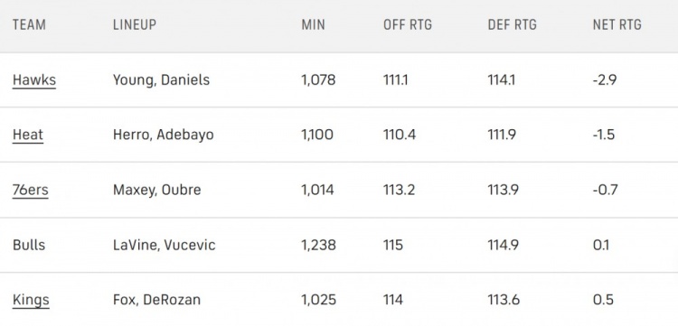 上图可见:倒数第一为老鹰的特雷-杨和戴森-丹尼尔斯;倒数第二为热火的希罗和阿德巴约;倒数第三为76人的马克西和乌布雷;倒数第四为公牛的拉文和武切维奇;倒数第五为国王的福克斯和德罗赞。
