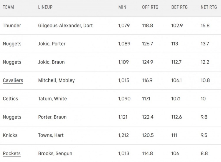 上图可见:第一名为雷霆的亚历山大和多特;第二名为掘金的约基奇和小波特;第三名为掘金的约基奇和布劳恩;第四名为骑士的米切尔和小莫布里;第五名为凯尔特人的塔图姆和德里克-怀特;第六名为掘金的小波特和布劳恩;第七名为尼克斯的唐斯和哈特;第八名为火箭的狄龙-布鲁克斯和申京。