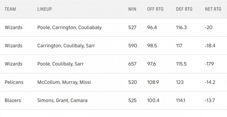最差五人组:天哪,我们知道奇才真的很糟糕,但没想到会这么糟糕。从纸面上看,这可能是奇才最好的五名球员,但他们每百回合的净负分达到了33.5分!正如你所看到的,奇才与倒数第二的阵容之间存在着巨大的差距。作为参考,上赛季联盟最差的五人组(篮网的丁威迪、卡梅隆-托马斯、米卡尔-布里奇斯、卡梅隆-约翰逊和克拉克斯顿)的净效率值为-17,而奇才几乎比他们还要糟糕一倍,简直令人难以置信。