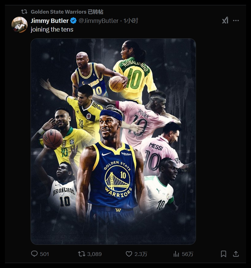 照片中人物(顺序为左右上下):蒂姆-哈达威、罗纳尔迪尼奥、哈梅斯-罗德里格斯、博格巴、内马尔(巴特勒亲承选择10号的主要原因)、梅西、?、马内。