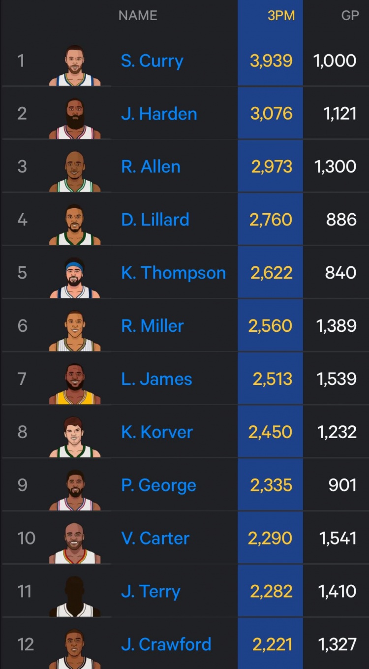 排名第12的贾马尔-克劳福德投进2221个三分,和排第2的哈登差了855个。