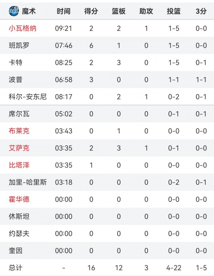 首节比赛,魔术全队状态低迷,共只投进了4个球(22中4)。