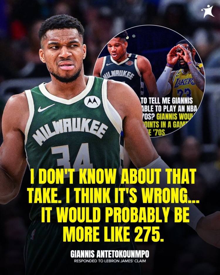 3月29日讯 此前,湖人前锋詹姆斯表示扬尼斯-阿德托昆博可以在70年代的一场比赛中砍下250分。