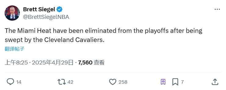 比分差距过大,以至于美记已经给热火“判死刑”了,美记Brett Siegel写道:“迈阿密热火已经被骑士队横扫出局。”