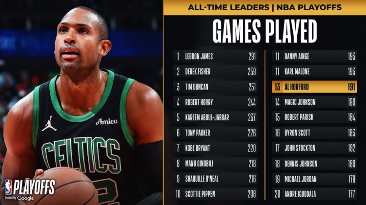 据统计,这是绿军老将霍福德职业生涯出战的第191场季后赛,超越魔术师约翰逊独占历史第13位。
