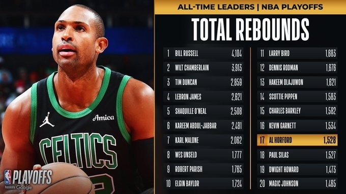 本场比赛过后,霍福德季后赛篮板数达到1528个,超越保罗-塞拉斯排名历史第17位!