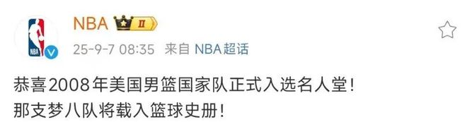 9月7日,据NBA官方消息:2008年美国男篮国家队正式入选篮球名人堂。08年北京奥运会,美国男篮“梦八队”以全胜战绩夺冠,时隔8年重夺奥运金牌。
