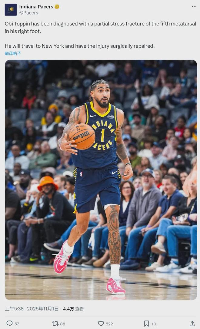 北京时间11月1日,NBA杯(季中赛)小组赛正式开打:老鹰128-108大胜步行者。本赛季至今,步行者0胜5负和篮网并列东部倒数第一。屋漏偏逢连夜雨,步行者官方今日宣布:奥比-托平被诊断出右脚第五跖骨部分应力性骨折。