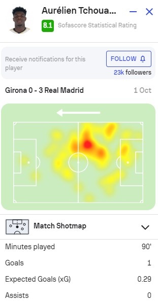 琼阿梅尼本场对阵赫罗纳数据:1进球1关键传球,SofaScore评分8.1