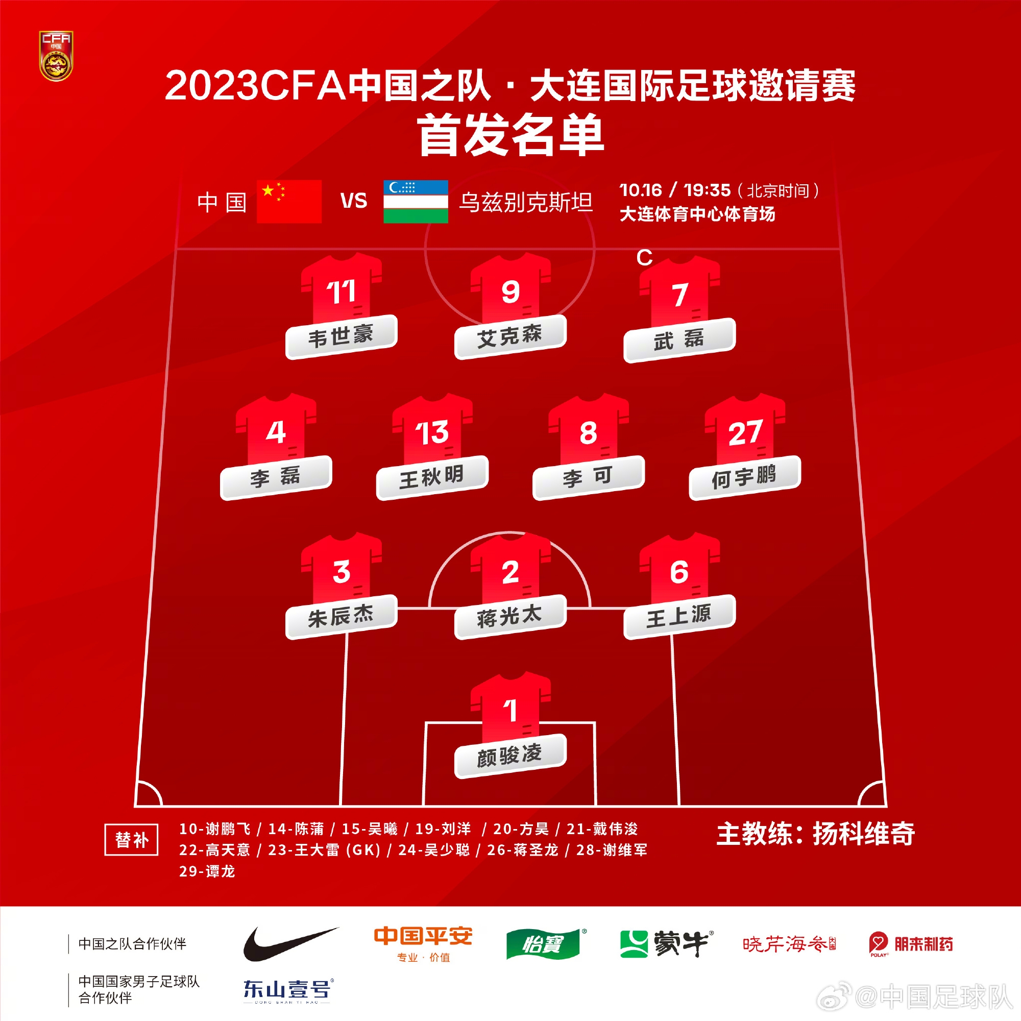 中国队vs乌兹别克斯坦队比赛中国男足首发名单,阵型343