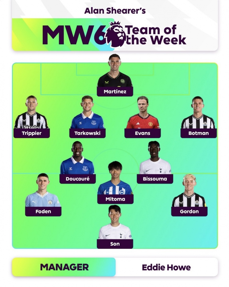 阿兰希勒评选英超周最佳阵:孙兴慜&三笘薰在列,埃文斯入围