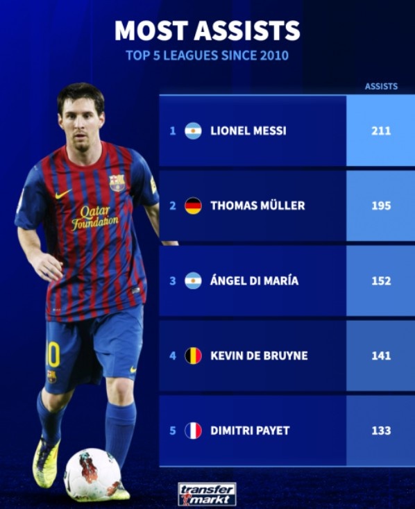 2010年至今五大联赛助攻榜:梅西211次第1,穆勒195次第2