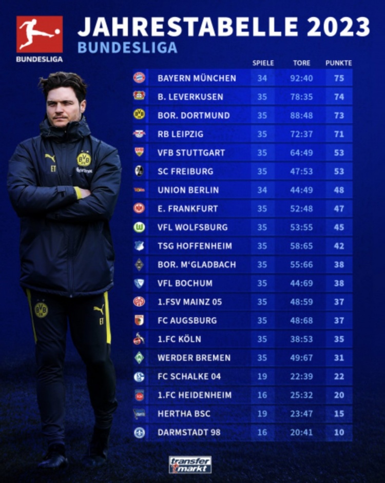 德甲2023年度积分榜:拜仁75分第一,药厂74&多特73列二三位