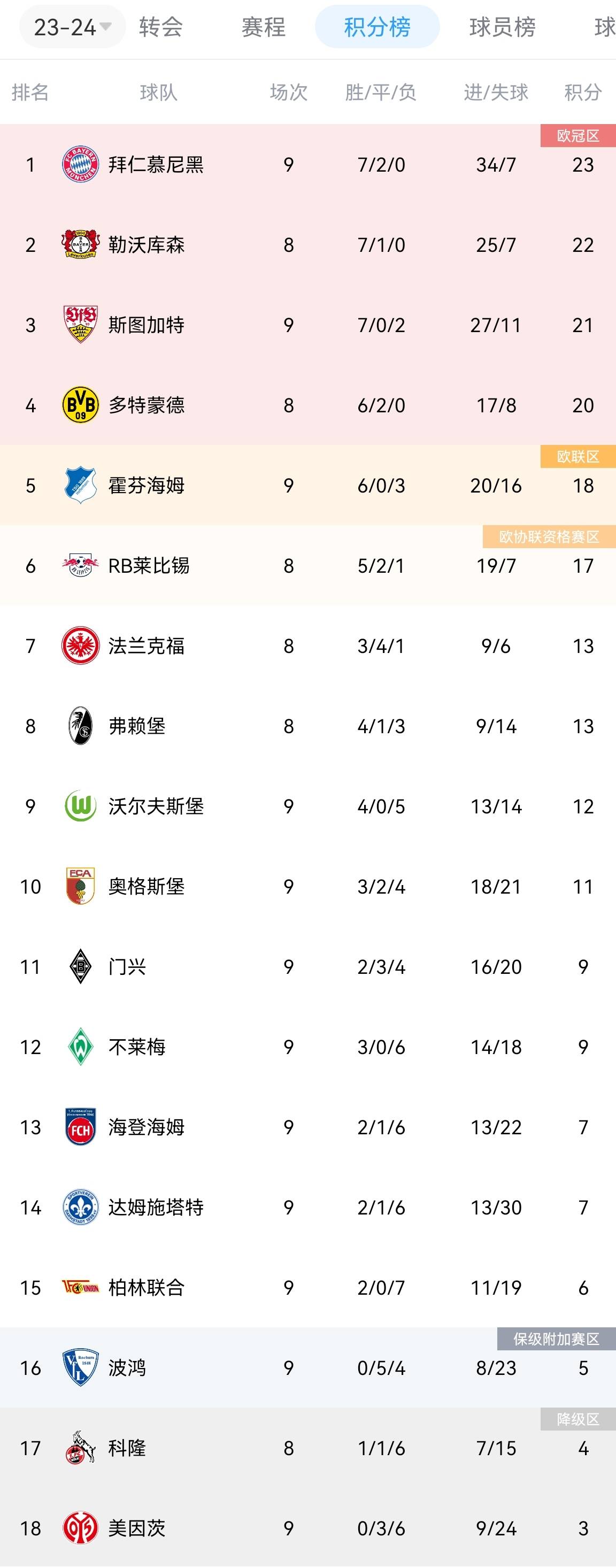 德甲积分榜:拜仁暂登顶,斯图加特输球降至第三,药厂多特未赛