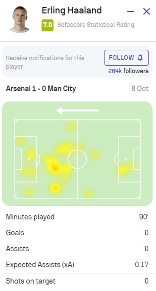 哈兰德本场对阵阿森纳数据:全场0射门+2关键传球,评分7.0