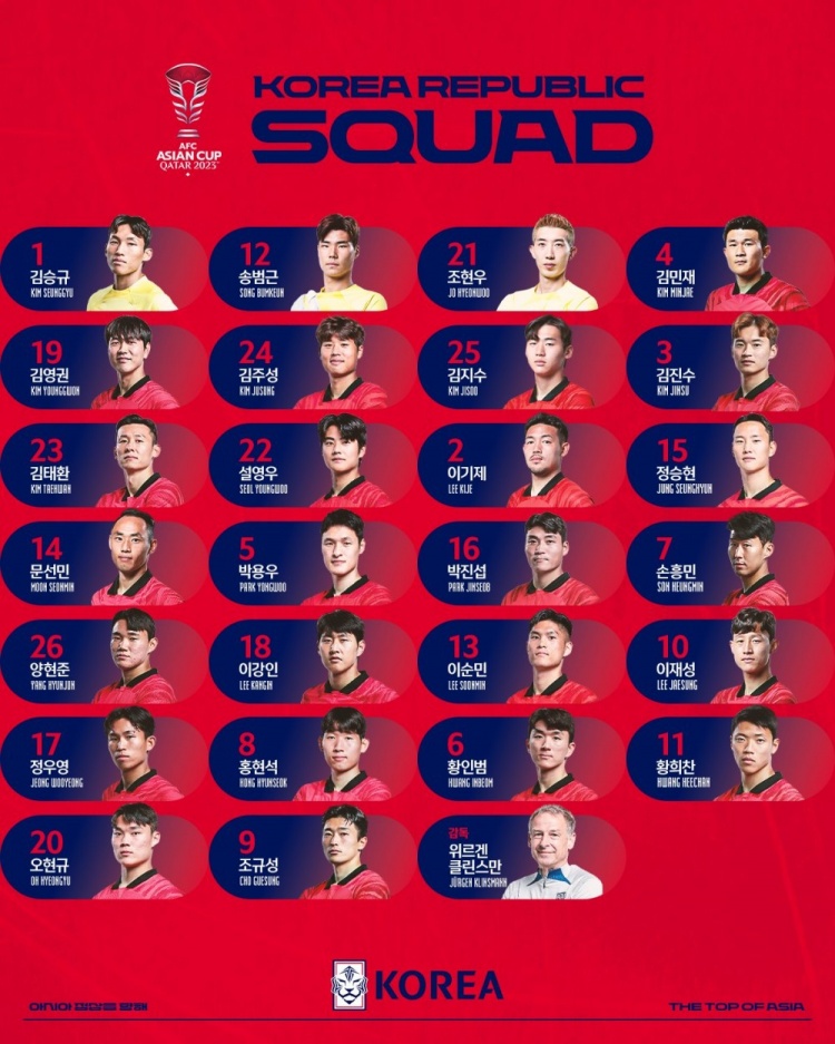 韩国队亚洲杯26人名单及号码公布:孙兴慜7号,李刚仁18号