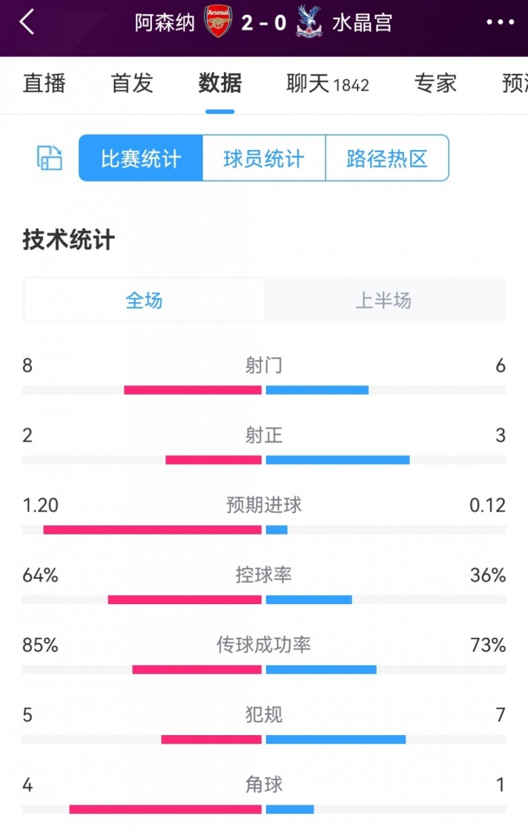 阿森纳vs水晶宫半场数据:射门86,射正23,枪手控球率64%