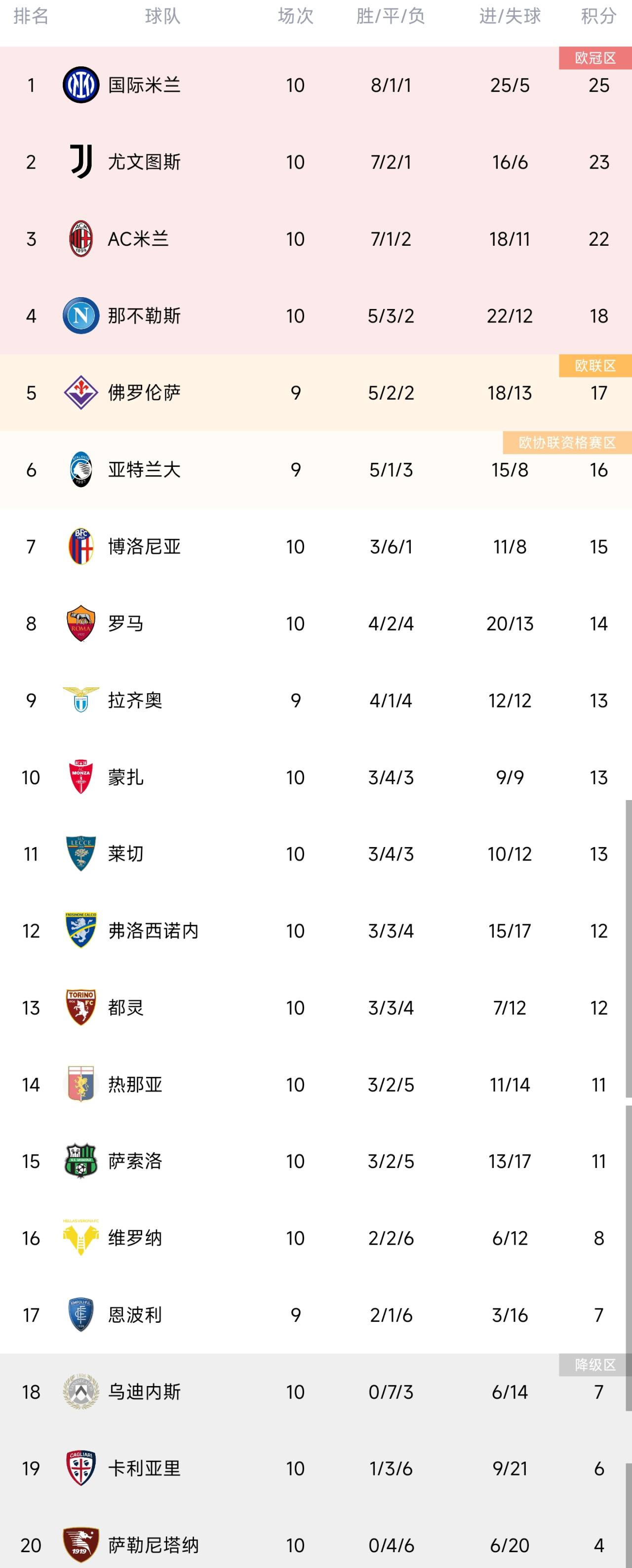 本赛季意甲积分和上赛季同期比较:国米&尤文+7,那不勒斯&罗马8