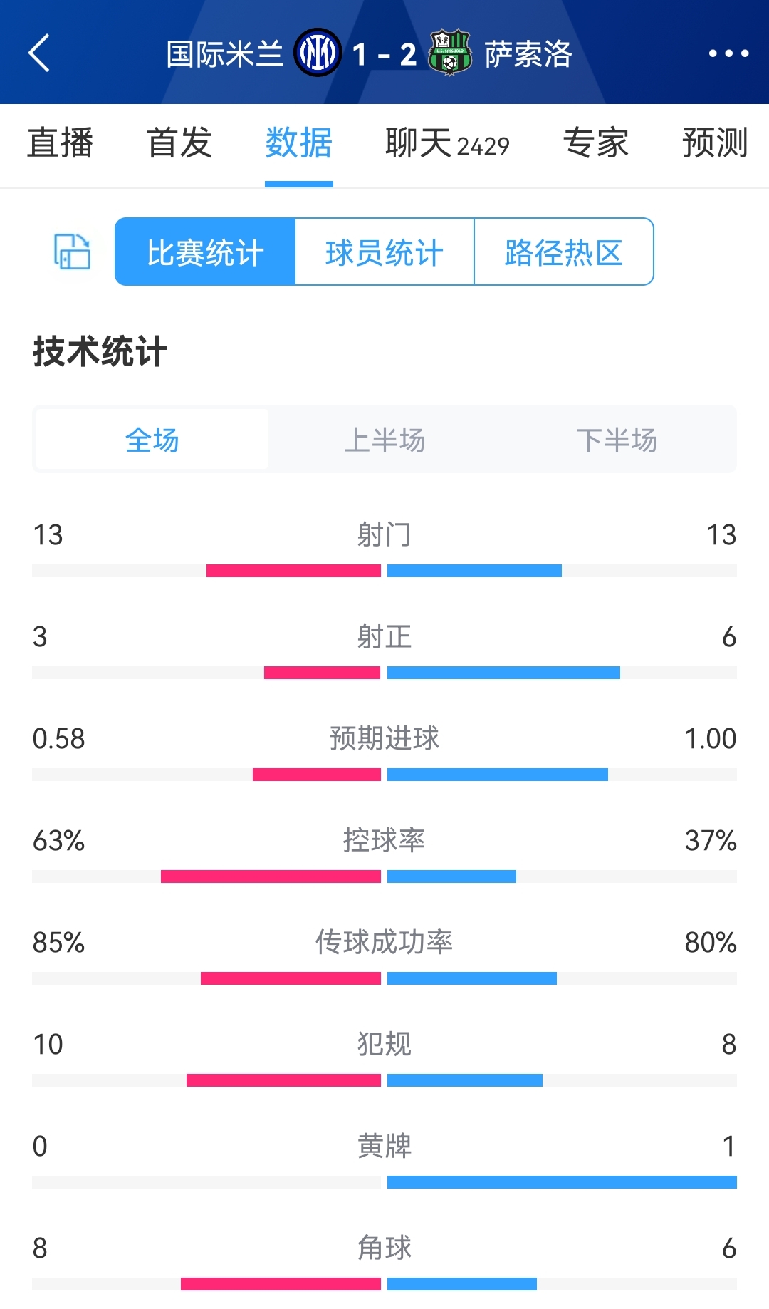 国米12萨索洛全场数据:13次射门持平,射正36,国米控球率63%