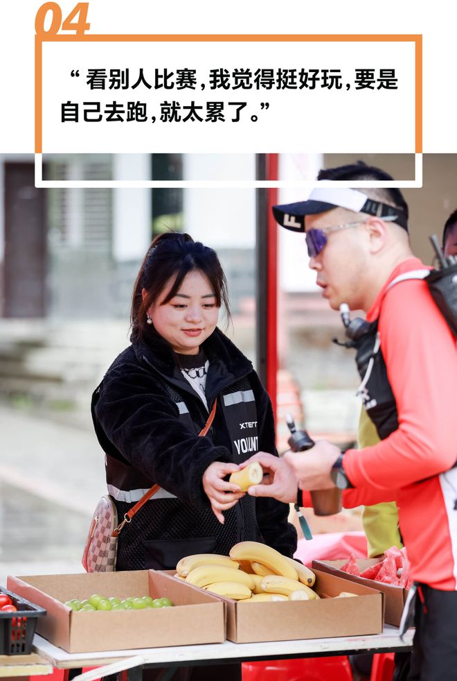 小唐是赛道补给站的志愿者,这是她第一次参加XTERRA的活动。她和同伴都是附近村子里的本地人,平时也爬山。正因为是本地人,她们深知赛道的难度,“全是山路,跑下来是非常辛苦的”,所以非常佩服能坚持下来的选手。小唐平时从事旅游业,这次是刚好有时间来体验志愿者服务。她觉得志愿者工作并不辛苦,而最让她激动的瞬间,是看到跑在第一、二、三名的选手近距离经过站点,“像是看到了明星一样。”
