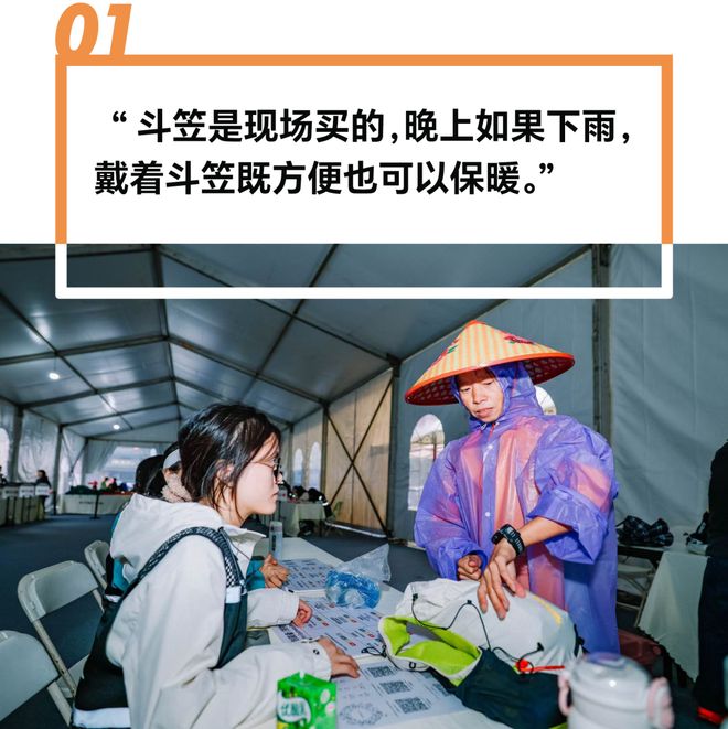 在选手领物现场,出现了一道披着紫色雨披,背着斗笠正进行强装检查的身影。旁边同行的男人拖着行李箱在一旁等待着她。来自湖南怀化的张秀梅,这次跟丈夫一起来参加的是88公里组别的比赛。