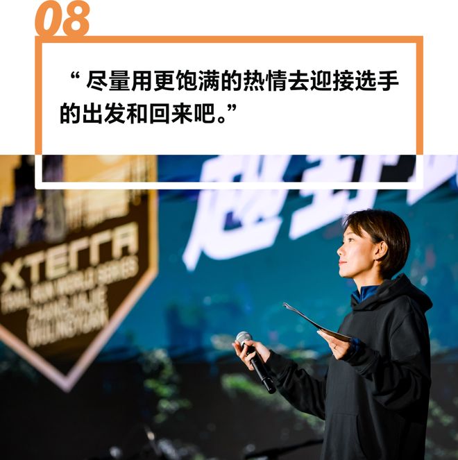 早上五点过,主持人小美已经在比赛现场做好准备等待着选手们的到来。对于保持主持人充沛状态的秘诀,她表示自己曾经做铁三和越野选手的时候,如果现场的MC、志愿者们能给到她很多的热情,那将会让她更加充满能量。所以当自己做主持人的时候,她也想以自己的最大力量让这些选手们感受到热情和支持。