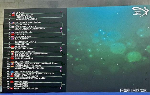 九江站:李吉妮、格鲁比奇、帕克斯、库德梅托娃位列前四号种子。中国有六将出战,其中白卓璇vs李吉妮、朱琳vs 帕克斯、韦思佳vs 邦达尔、朱宸汀vs 塔格尔、郑妩双vs 斯塔罗杜布采娃、袁悦vs资格赛球员。