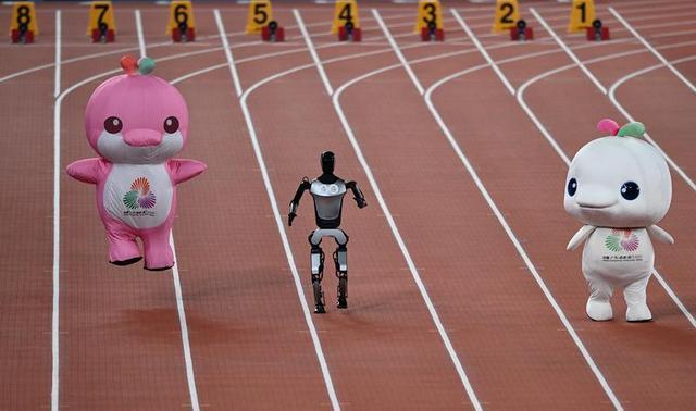 发令枪响后,三名“运动员”开始“奔跑”。机器人迈着稳健的步伐向前,两只吉祥物一边扭动着胖胖的身躯前进,一边蹦蹦跳跳,还不时回头“挑衅”机器人,逗笑了现场观众。而Walker不为所动,依旧按照自己的速度和节奏奔跑。