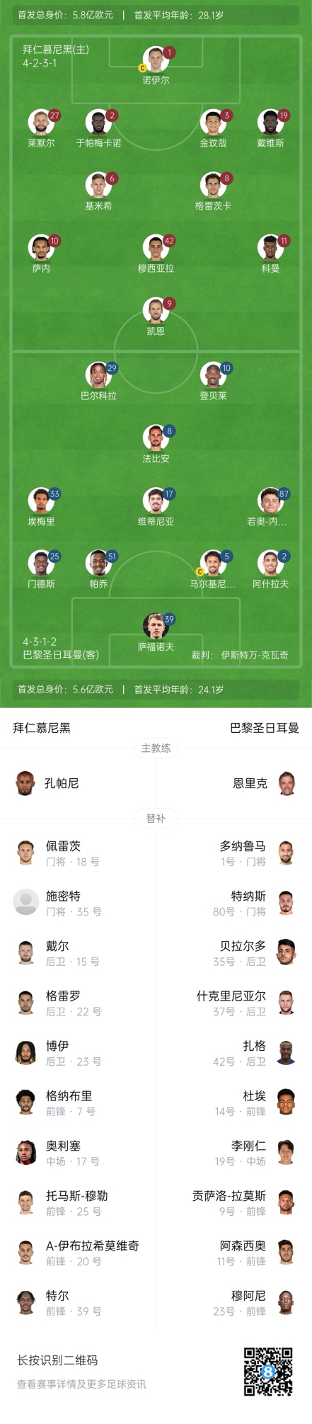 11月27日讯 欧冠联赛阶段第5轮,拜仁慕尼黑主场迎战巴黎圣日耳曼,赛前首发名单公布。