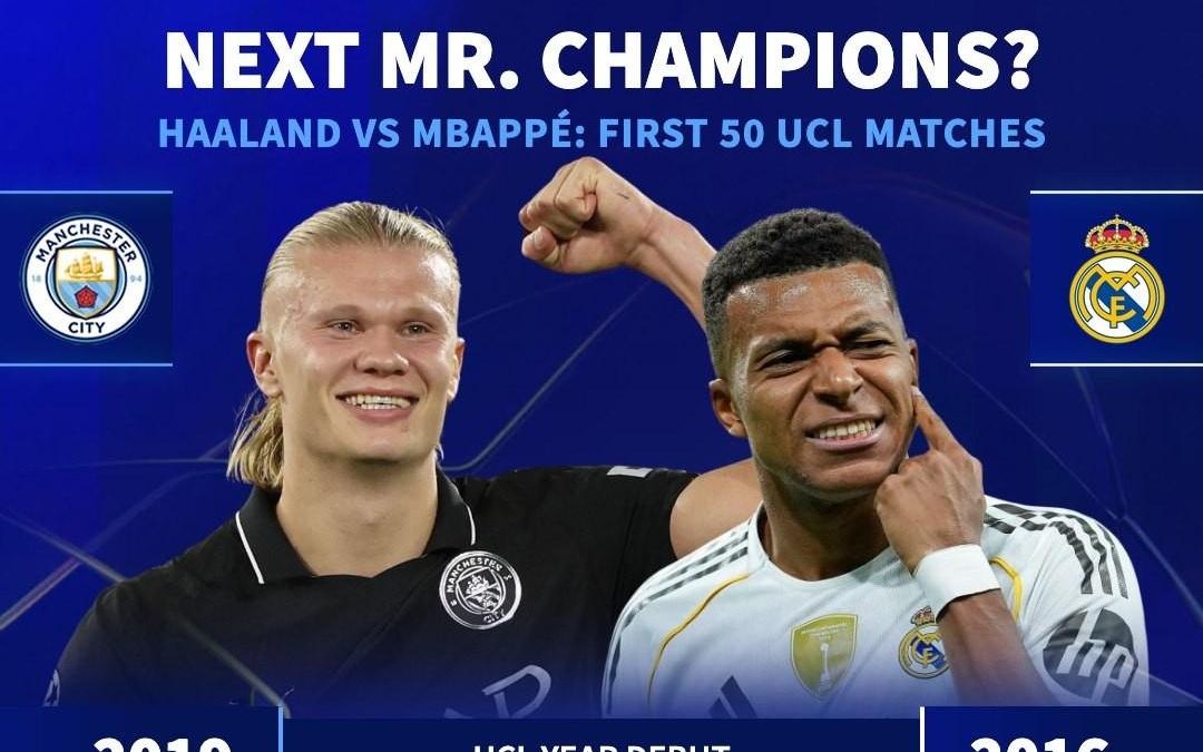 哈兰德与姆巴佩前50场欧冠数据对比:进球5228,助攻521