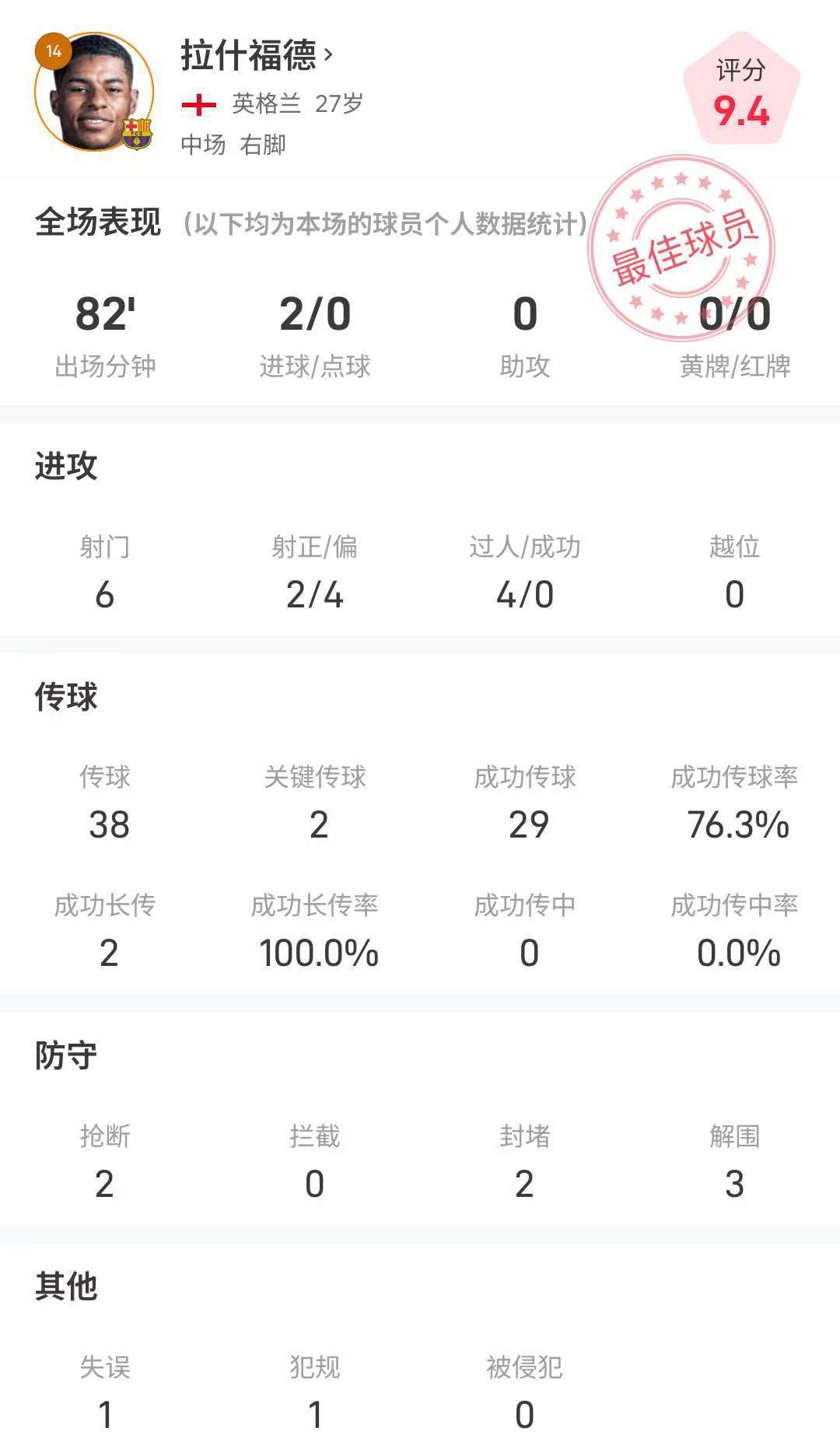 梅开二度!拉什福德全场数据:6射2正进2球,2次关键传球