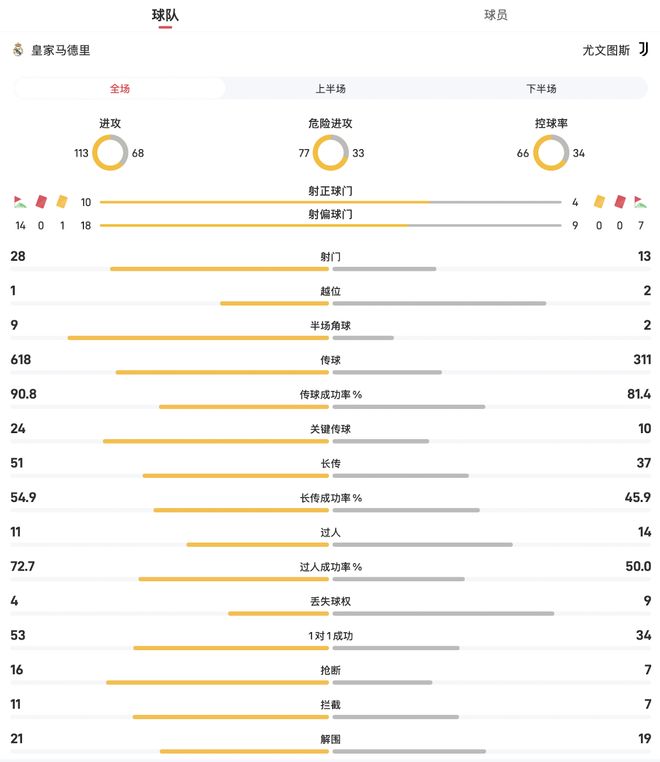 雷速体育10月23日讯 欧冠联赛阶段第三轮,皇马主场凭借贝林厄姆的进球,1-0战胜尤文图斯。皇马全场比赛数据占优,但尤文的防守非常稳健。皇马仅是靠比赛第57分钟,维尼修斯的边路爆破创造机会,贝林厄姆补射破门打入一球,最终小胜对手。