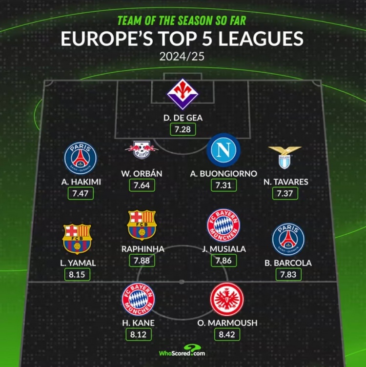 11月17日讯 WhoScored列出了本赛季至今五大联赛最佳阵容,凯恩、亚马尔、拉菲尼亚、穆西亚拉,德赫亚在列。
