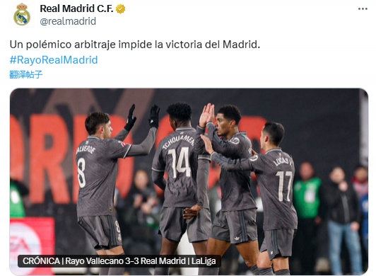 皇马社媒和战报直接标题抗议判罚:“一个有争议的判罚阻止了皇马获胜。”