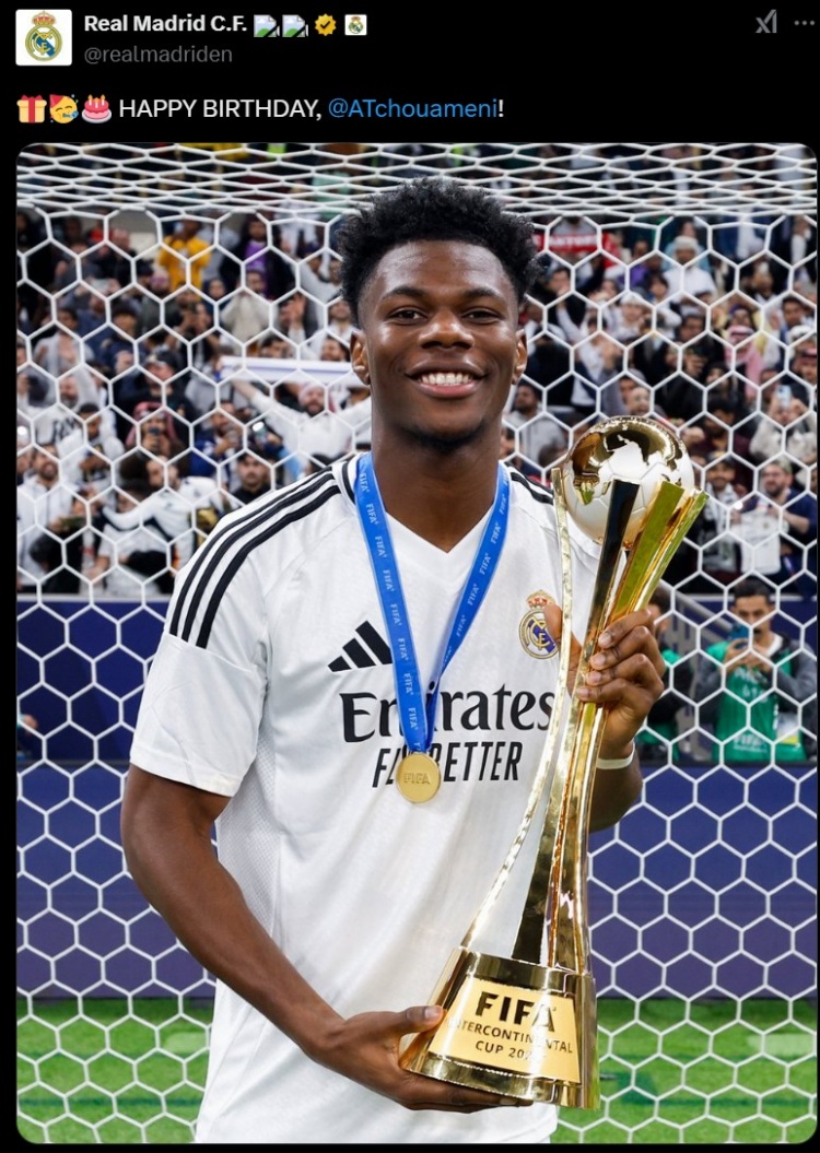 1月27日讯 今天是法国球员琼阿梅尼25岁生日,皇马官方也晒照为其送上生日祝福。