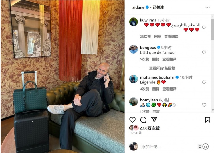 齐达内在社交媒体上晒出自己在旅途中的照片,坐在沙发上打电话的齐祖露出笑容,而沙发边上则放着他的行李箱。