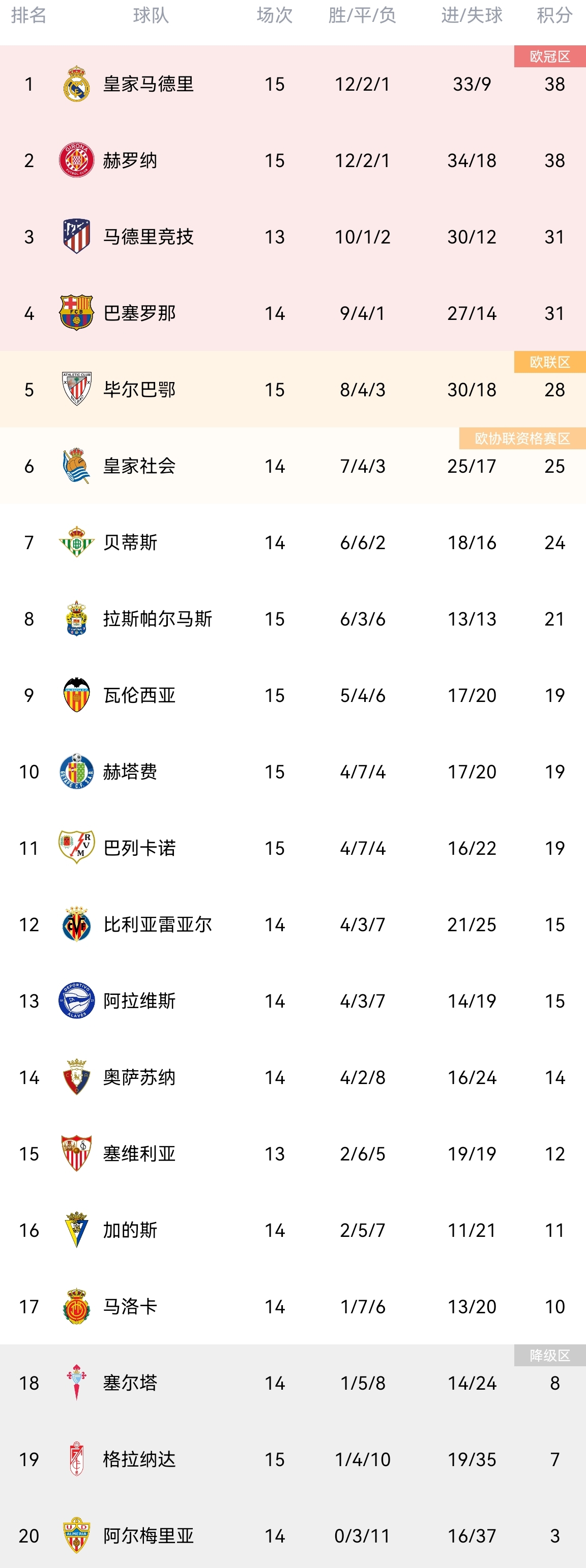 西甲积分榜更新,皇马与赫罗纳同积38分列前二,马竞和巴萨少赛暂列第三、第四位。