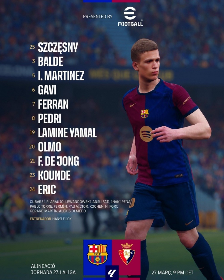 3月28日讯 西甲第27轮补赛,巴萨vs奥萨苏纳首发出炉。记者Toni Juanmartí谈到了本场比赛的首发阵容。