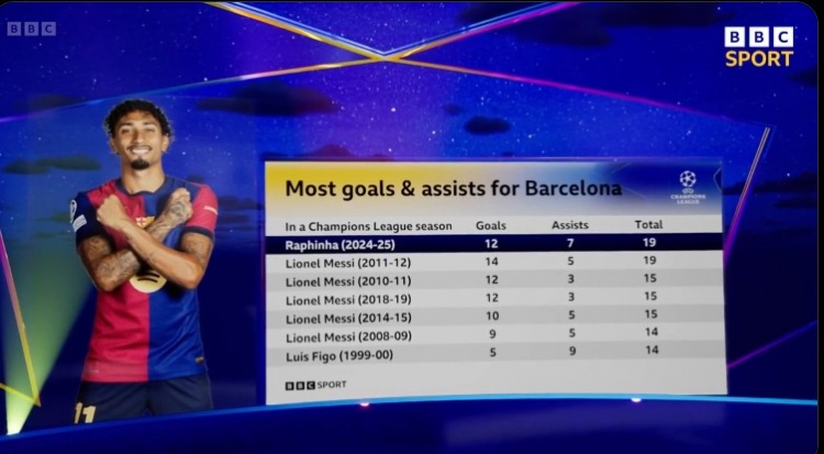 4月10日讯 在欧冠淘汰赛首回合巴萨4-0大胜多特的比赛中,拉菲尼亚1射2传,本赛季欧冠已经12球7助,直接参与19球。以下为巴萨球员在单赛季欧冠参与进球榜: