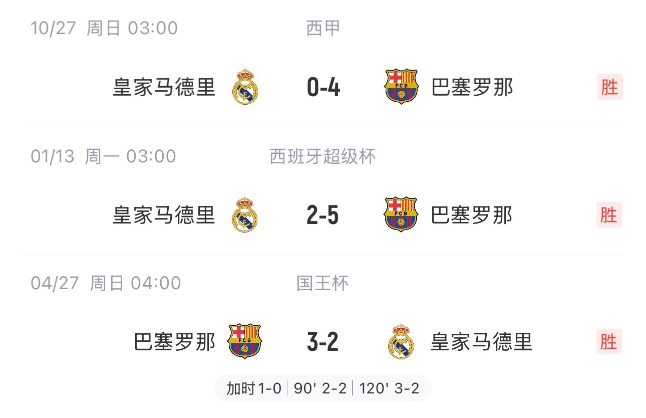 巴萨本赛季对皇马实现三连杀,比分分别是4-0、5-2、3-2,总比分12-4。