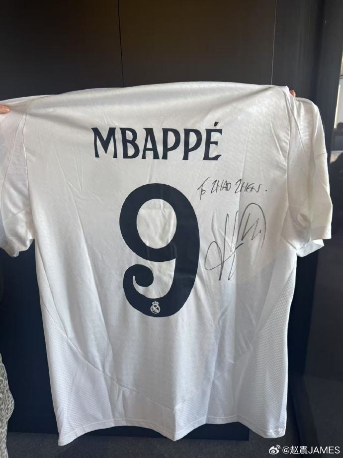 赵震晒出了一件姆巴佩的皇马9号球衣,姆巴佩在上面签下了“To ZHAO ZHEN”。赵震为此配文写道:“来自神龟的to签,冒热气的……”
